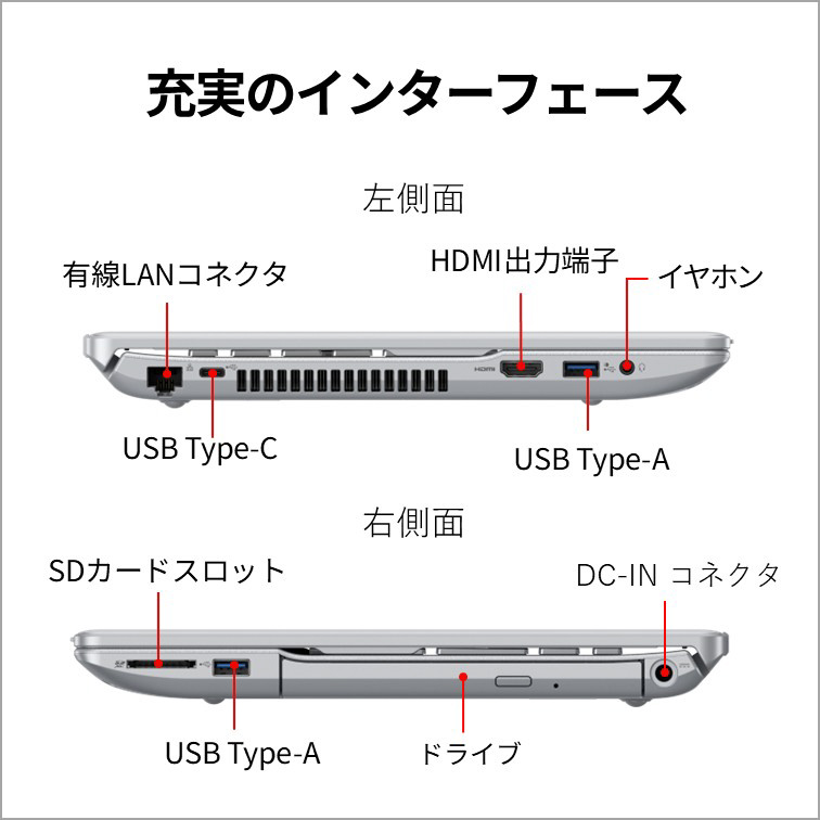 [ダイレクト・メモリースロット]SDメモリーカード対応x1 [USB-C] USB 3.2(Gen2)x1 [USB-A] USB 3.2(Gen1)x1 USB 3.2(Gen1)x1(電源オフUSB充電機能付) [映像入出力]HDMI出力端子x1 [LAN]RJ-45x1 [オーディオ]マイク・ラインイン・ヘッドホン・ラインアウト・ヘッドセット兼用端子x1(φ3.5mmステレオ・ミニジャック)