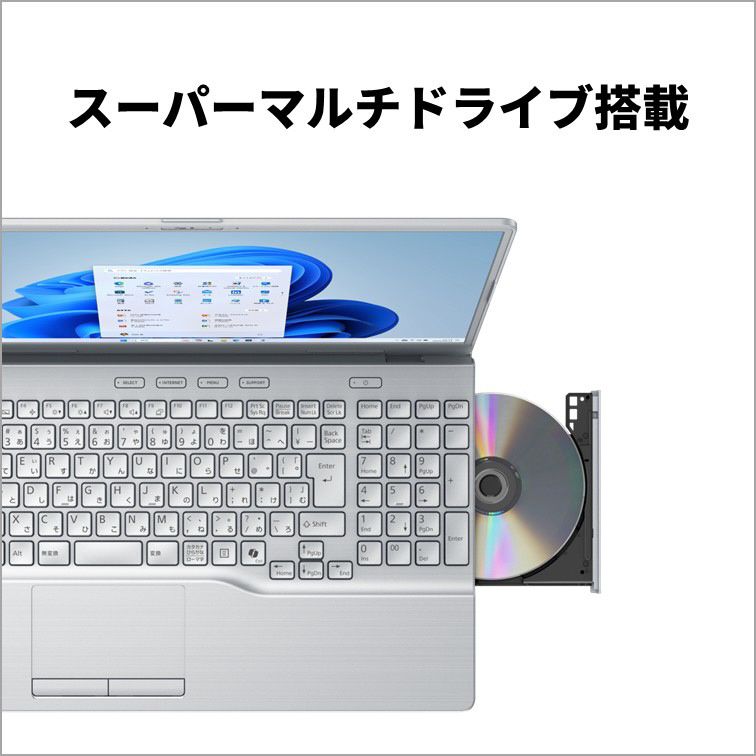 [表示機能] 内蔵ディスプレイ:スーパーファイン液晶(フルHD)、広視野角 パネルサイズ:15.6型ワイド 解像度/表示色:1920×1080ドット/1677万色 HDMI出力:最大4096×2160ドット/1677万色 [スーパーマルチドライブ]DVD±R DL(2層)書き込み対応