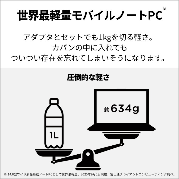 あらゆるシーンで活躍できる世界最軽量モバイル。(※14.0型ワイド液晶搭載ノートPCとして。2025年9月2日現在、富士通社調べ。)14.0型ワイド軽量モバイルノートPC。