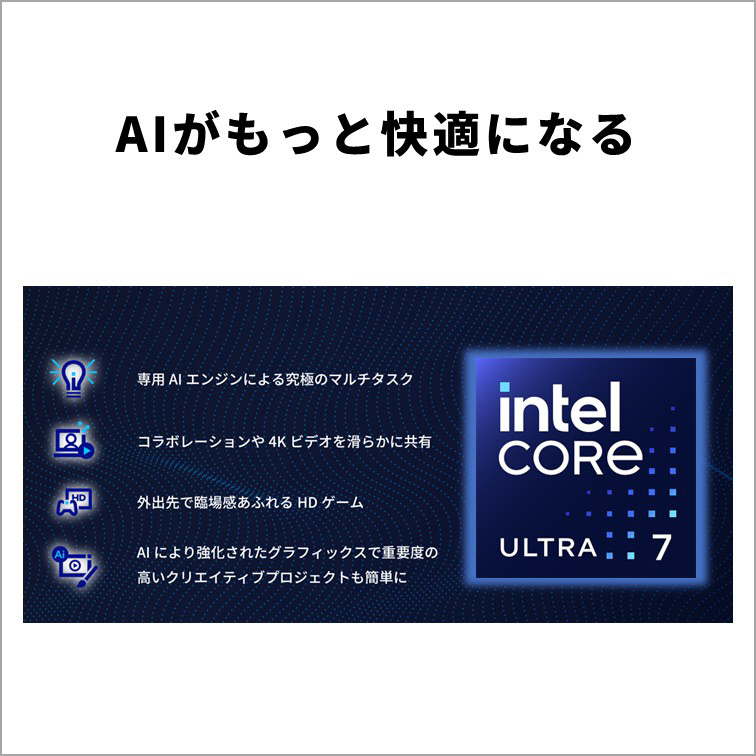 インテル Core Ultra 7 プロセッサー 255U(インテル HTテクノロジー対応) 動作周波数:Pコア 最大5.2GHz、Eコア 最大4.2GHz、低消費電力Eコア 最大2.4GHz コア / スレッド数:12コア(Pコア 2、Eコア 8、低消費電力Eコア 2) / 14スレッド キャッシュメモリ:12MB