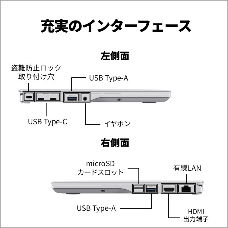 [ダイレクト・メモリースロット]microSDメモリーカード対応x1 [USB-C] Thunderbolt4 USB4 Gen3x2(USB Power Delivery対応、DisplayPort Alt Mode対応) [USB-A] USB3.2 Gen1x1 USB3.2 Gen1x1(電源オフUSB充電機能付) [映像入出力]HDMI出力端子x1 [LAN]RJ-45x1 [オーディオ]マイク・ラインイン・ヘッドホン・ラインアウト・ヘッドセット兼用端子x1(φ3.5mmステレオ・ミニジャック)