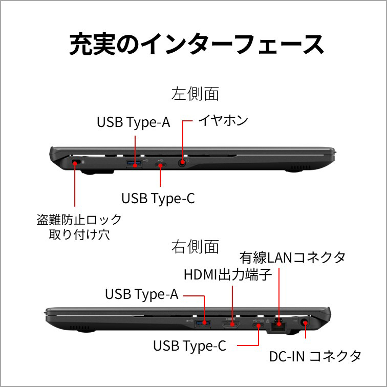 [USB-C] USB 3.2(Gen2)x1(USB Power Delivery対応、DisplayPort Alt Mode対応) USB 3.2(Gen1)x1 [USB-A] USB 3.2(Gen1)x1(電源オフUSB充電機能付) USB 3.2(Gen1)x1 [映像入出力]HDMI出力端子x1 [LAN]RJ-45x1 [オーディオ]マイク・ラインイン・ヘッドホン・ラインアウト・ヘッドセット兼用端子x1(φ3.5mmステレオ・ミニジャック)