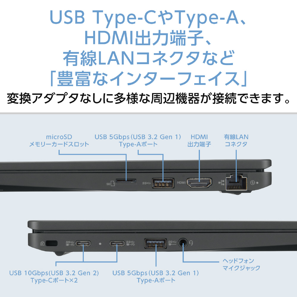USB-C (USB 10Gbps、USB3.2 Gen2) x2 ※USB Power Delivery3.0対応(パワーオフUSB充電機能付き)、ACアダプタの接続ポートを兼用、DisplayPort出力機能付き USB-A (USB 5Gbps、USB3.2 Gen1) x2 ※内1ポートはパワーオフUSB充電機能付き HDMI出力端子 x1 LAN RJ45 x1 ヘッドフォンマイクジャック(3.5mm 4極ミニジャック)x1 microSDメモリーカードスロット(microSDHC/microSDXC)x1