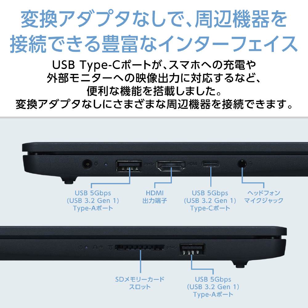 USB-C (USB 5Gbps、USB3.2 Gen1)x1 ※ ※USB Power Delivery3.0対応、DisplayPort出力機能付き、パワーオフUSB充電機能付き USB-A (USB 5Gbps、USB3.2 Gen1)x2 HDMI出力端子x1 SDメモリカードスロットx1 ヘッドフォンマイクジャックx1