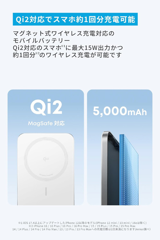 マグネット式ワイヤレス充電対応のモバイルバッテリーで、Qi2対応のスマホに最大15W出力かつ約1回分のワイヤレス充電が可能です。