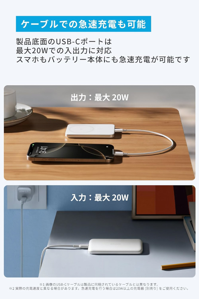 製品底面のUSB-Cポートは最大20Wでの入出力に対応。スマホもバッテリー本体にも急速充電が可能です。