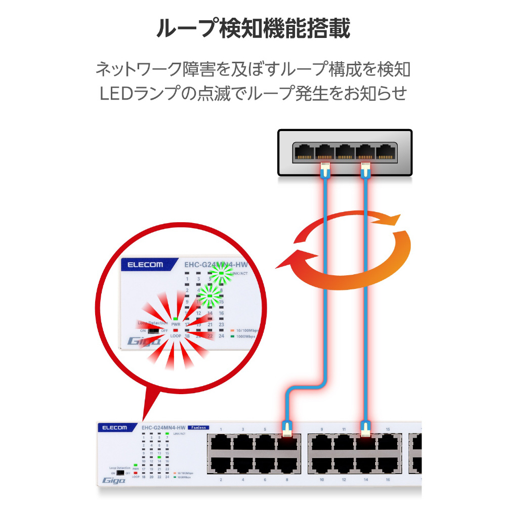 LEDランプの点滅によりネットワークループ発生をお知らせし、ネットワーク障害の解消を促します。