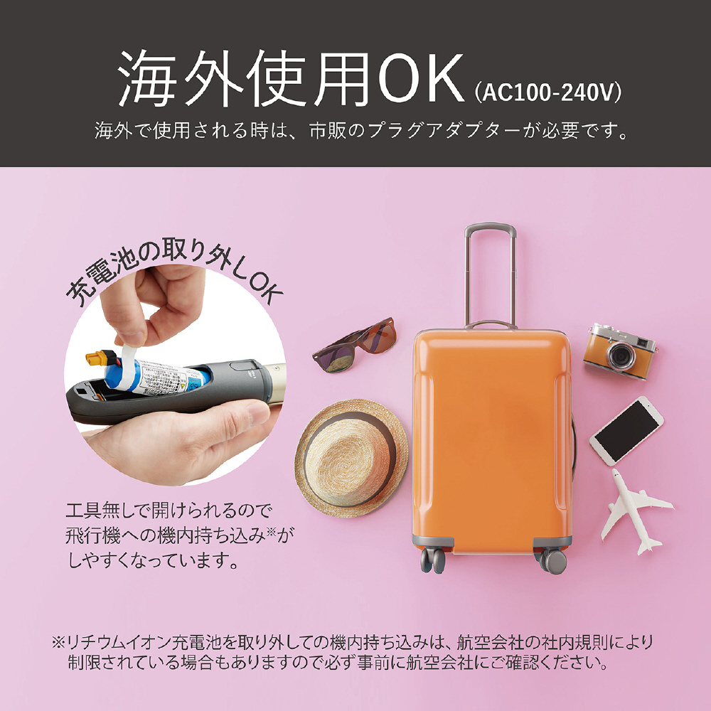 海外使用OK、充電池取り外しOK、キャップ付きで旅行にも便利。