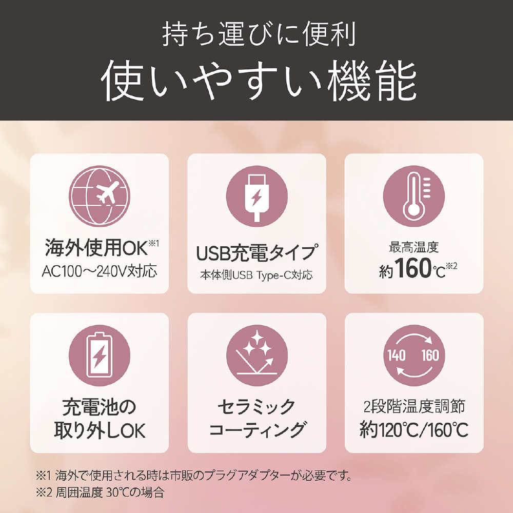 ・充電時間/持続時間:充電時間約4時間、連続使用時間約20分(160℃設定でカールアイロン使用時)