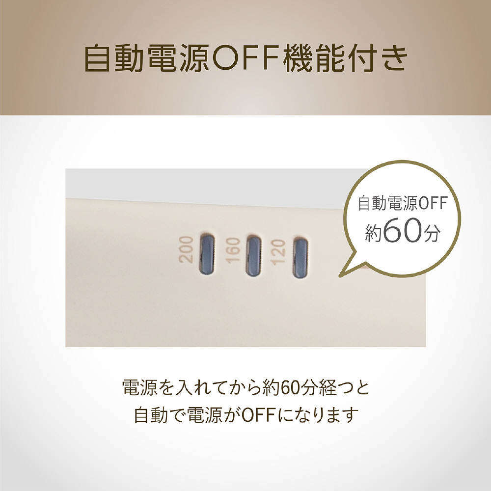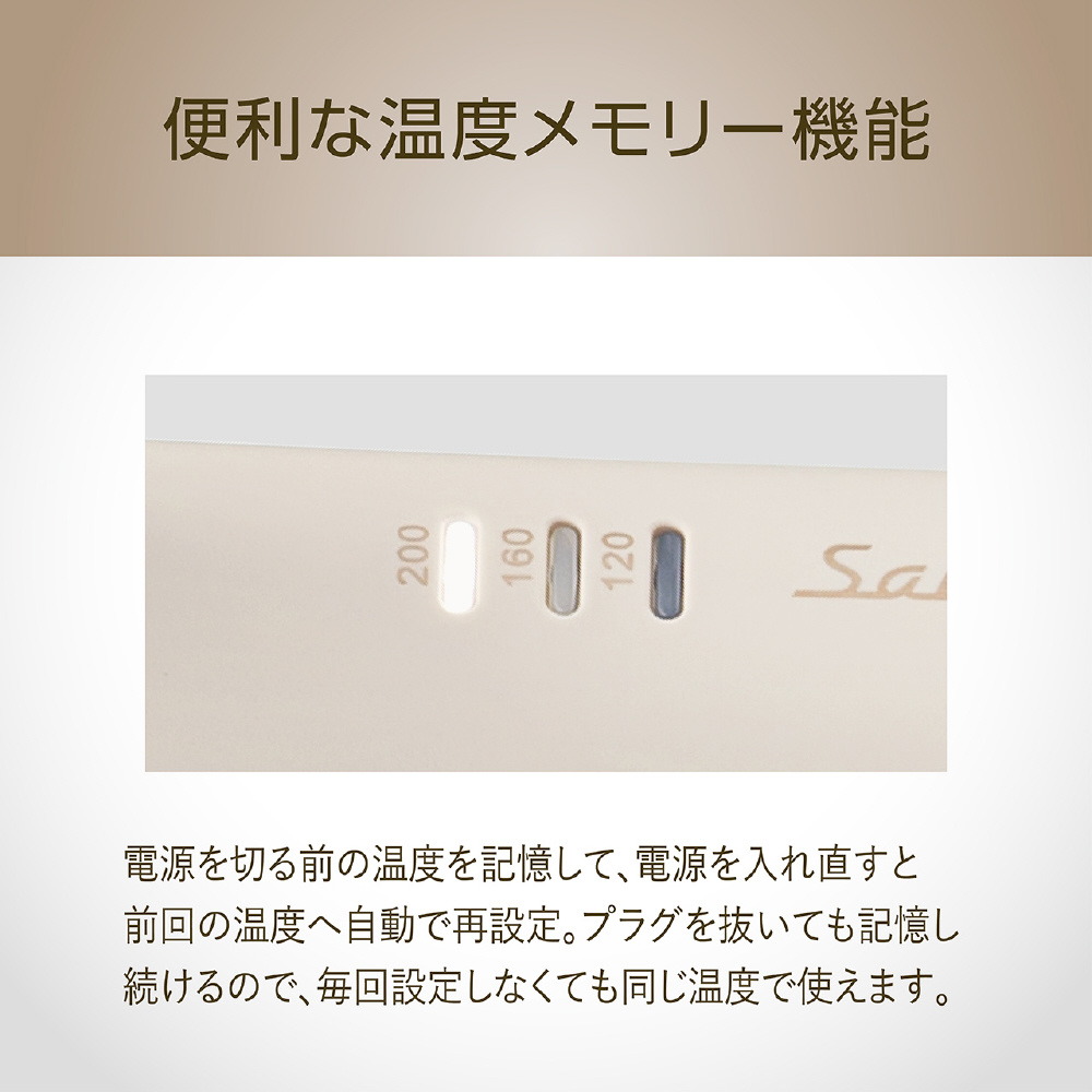 3段階温度調節(120/160/200℃)、マイナスイオン機能