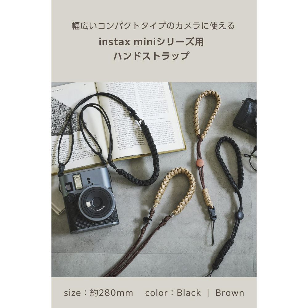 “instax”(チェキ)や“写ルンです”など、幅広いコンパクトタイプのカメラに使えるハンドストラップです。