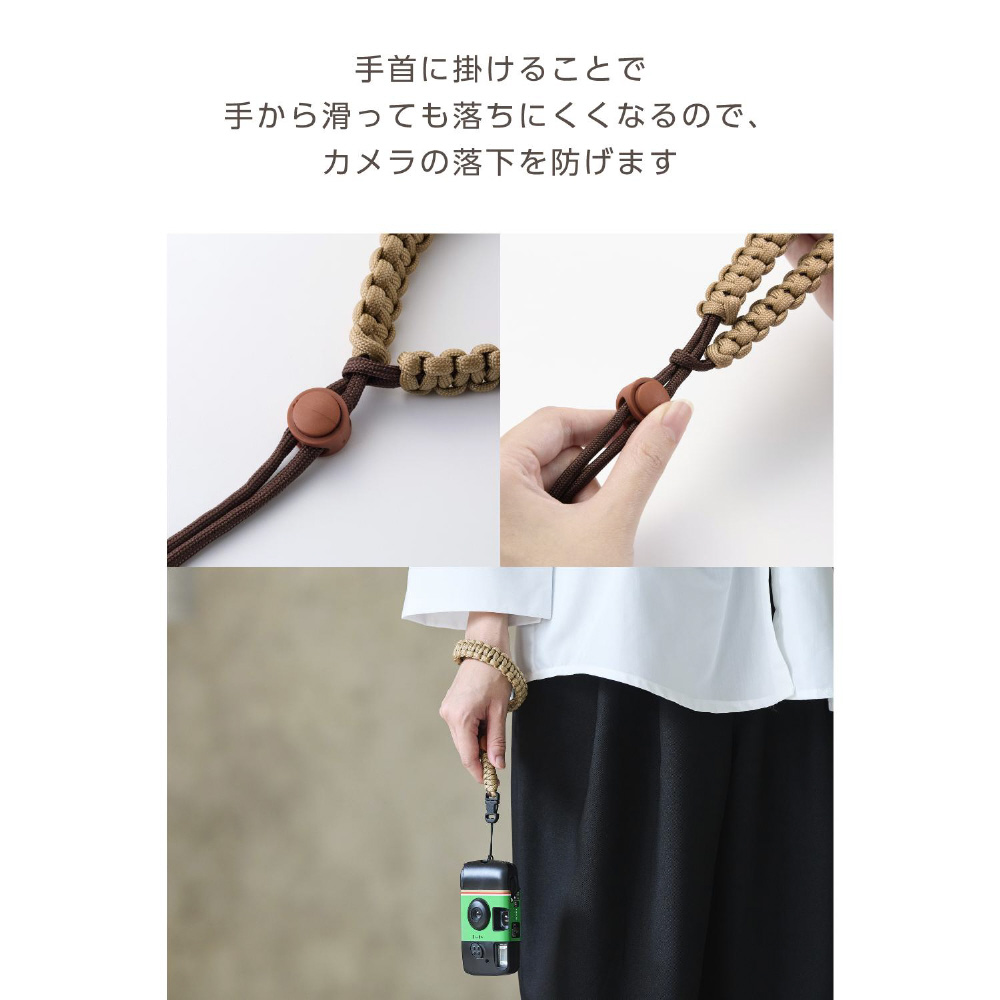 手首に掛けることで手から滑っても落ちにくく、カメラの落下を防げます。
