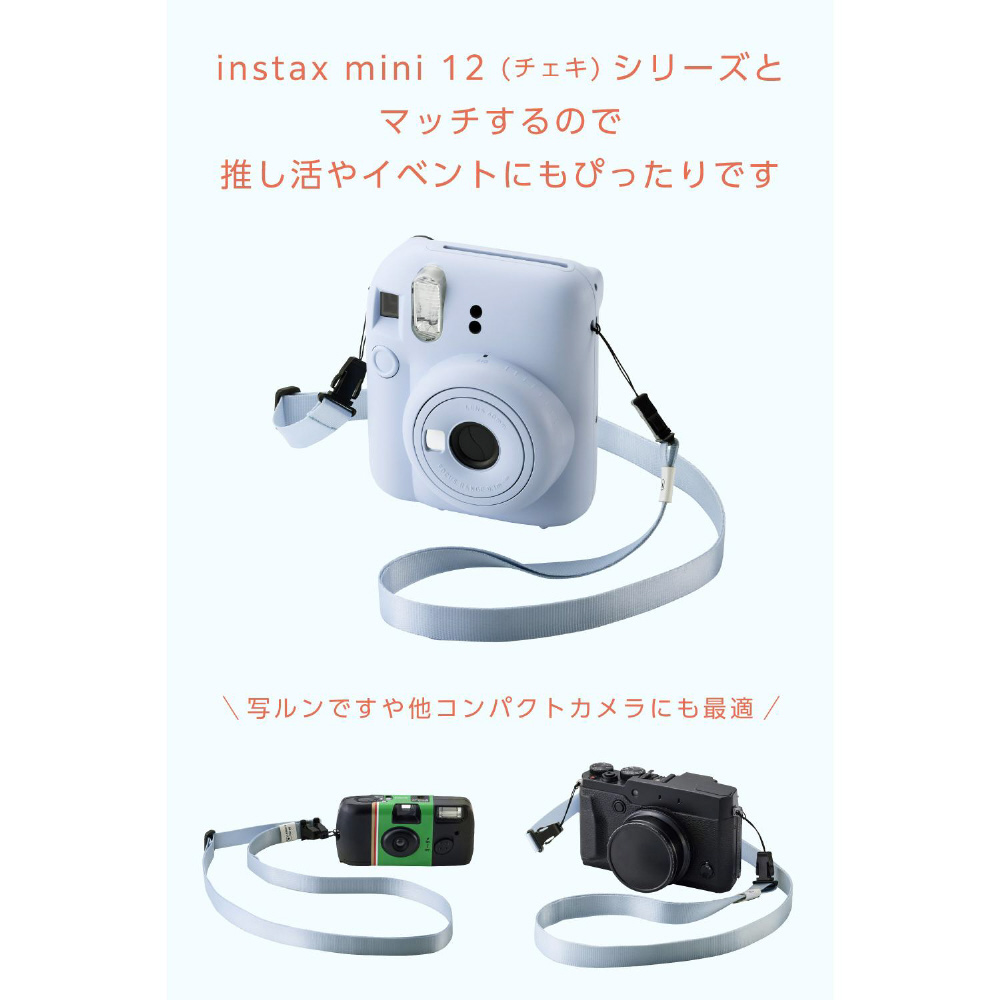 “instax”(チェキ)や“写ルンです”など、幅広いコンパクトタイプのカメラに使えるネックストラップです。首掛け、肩掛け、たすき掛けの3WAYタイプ。カメラを首や肩に掛けておけば、バッグから出さずにすぐ撮影できるので、撮りたい瞬間を逃しません。instax mini 12(チェキ)シリーズとのカラーコーディネートも楽しめ、カメラやカメラケースとお揃いにすればファッションのアクセントとしても活躍します。