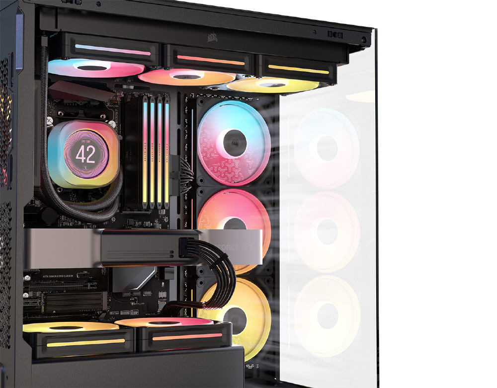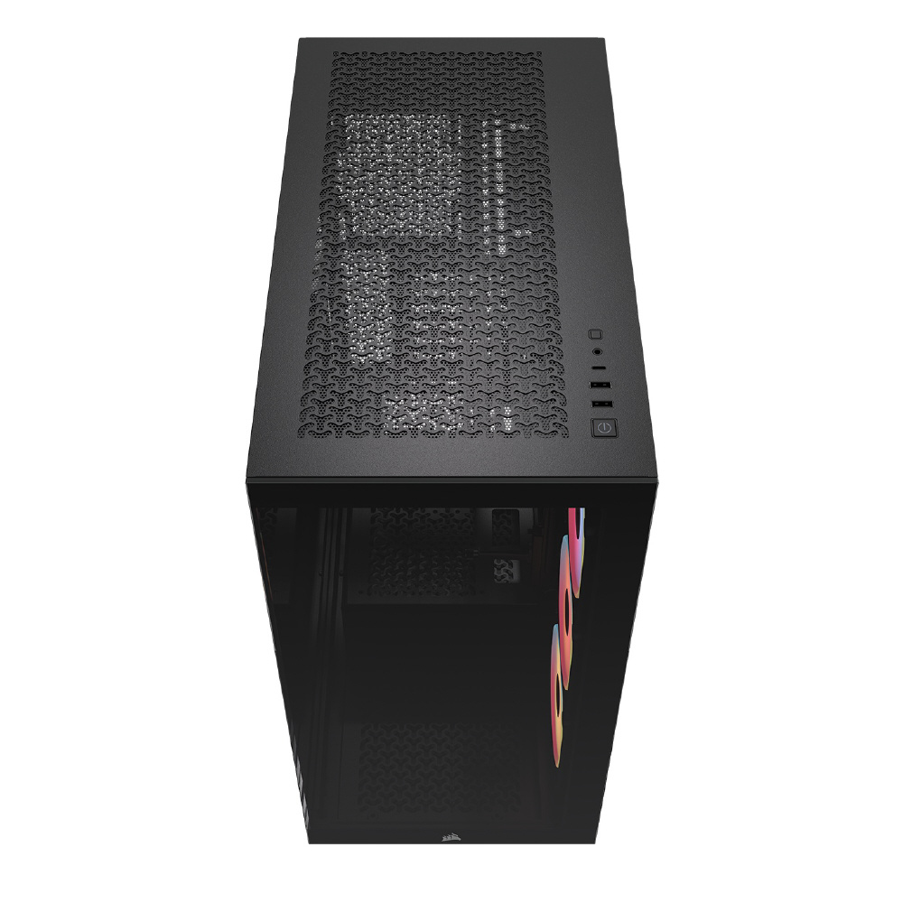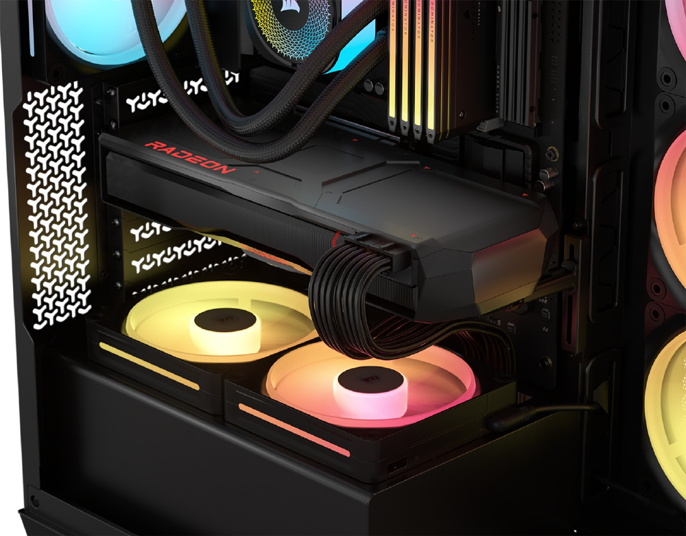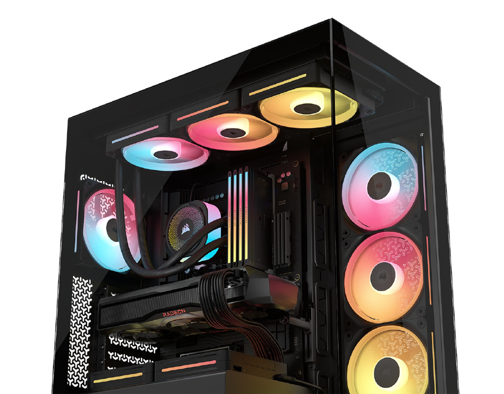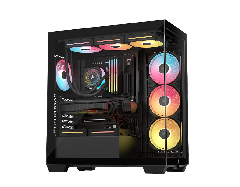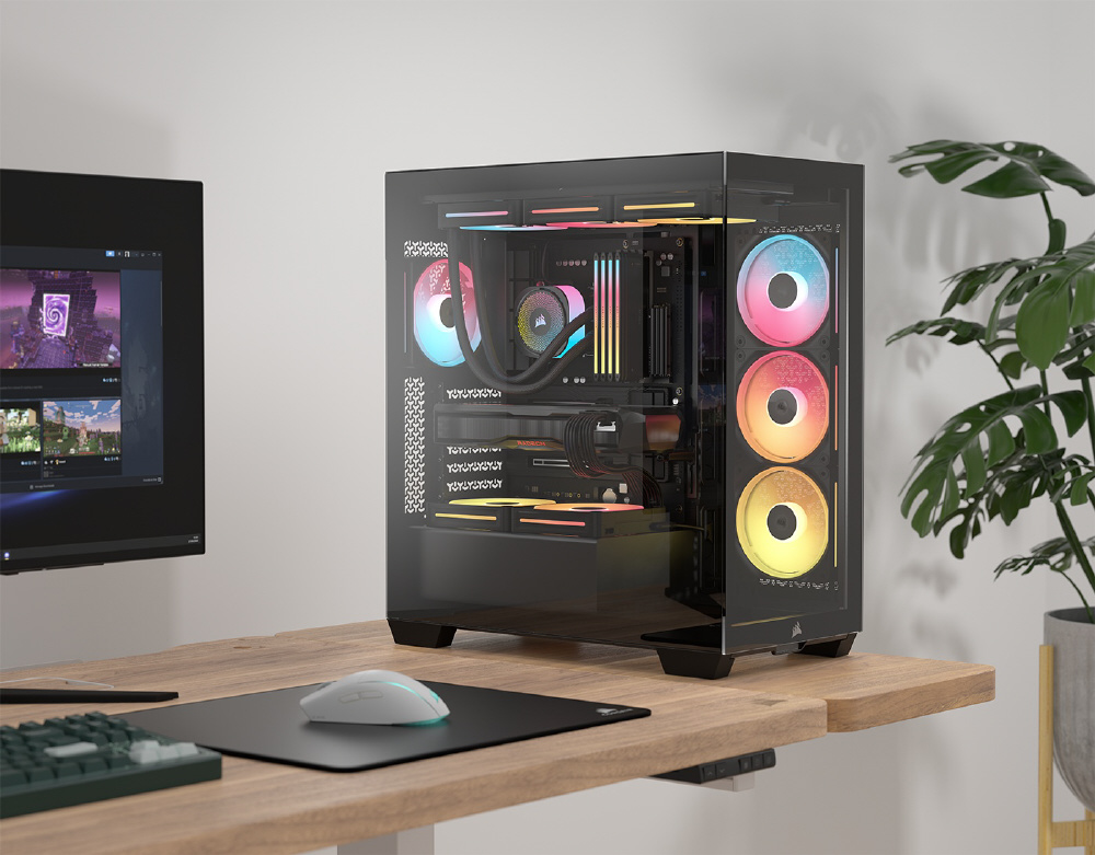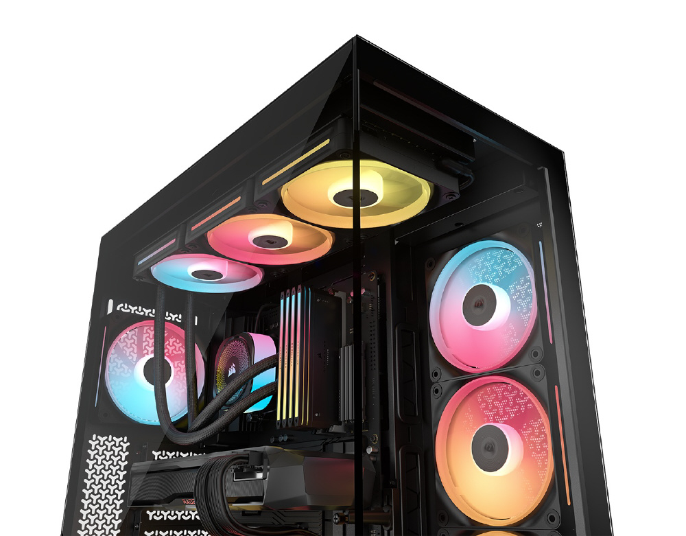 リバースローター設計のiCUE LINKファンを搭載。背面コネクタ設計のマザーボードに対応するピラーレスデザインのミドルタワー型PCケース