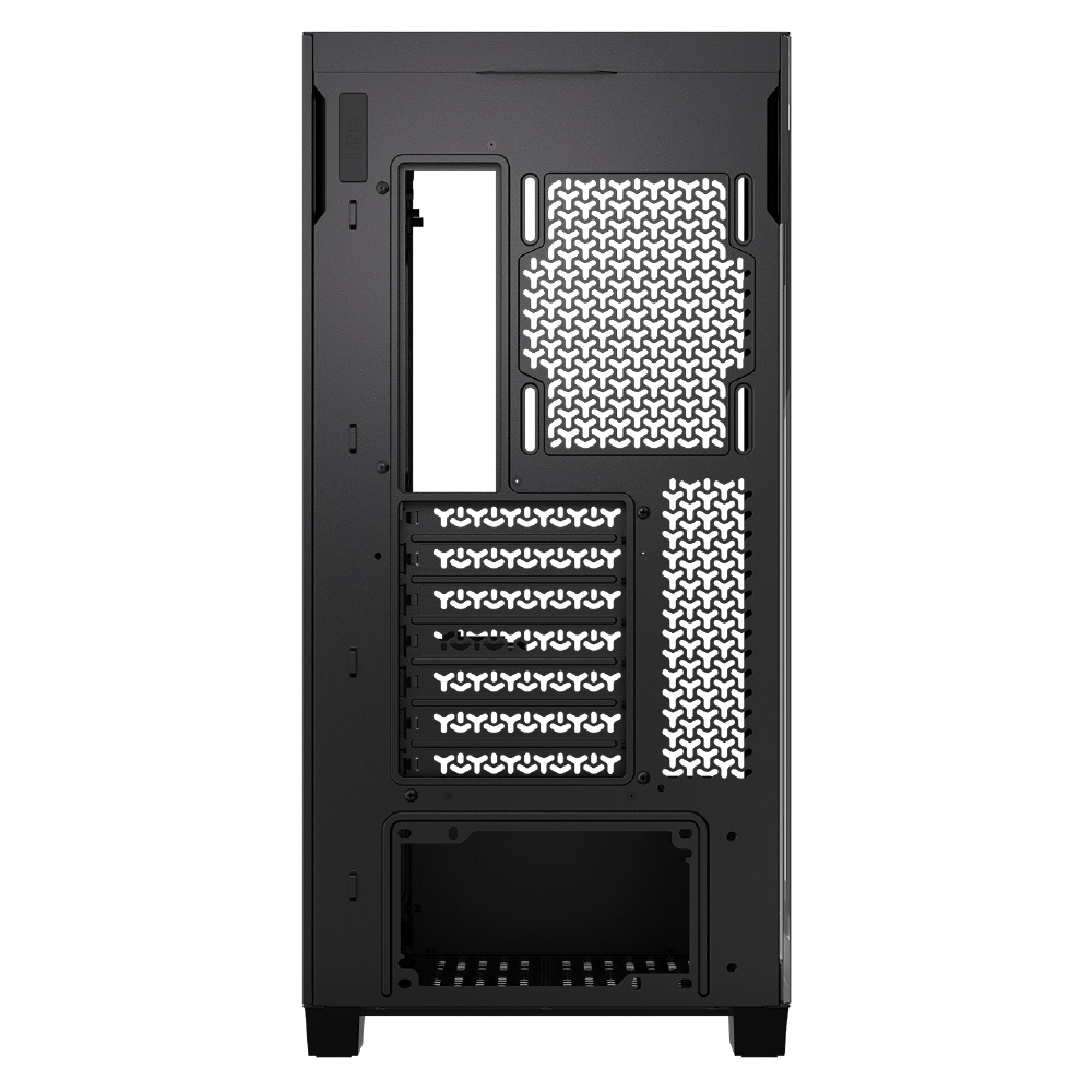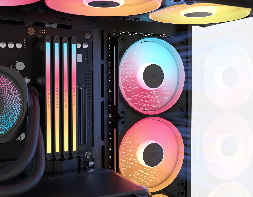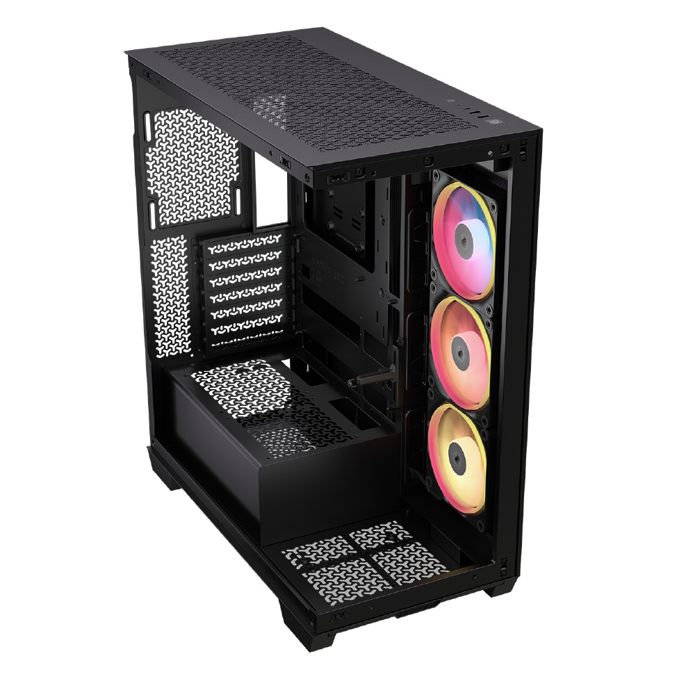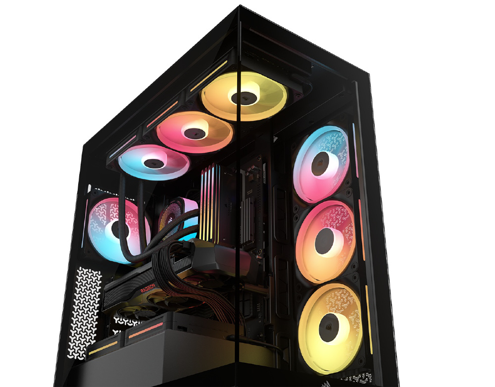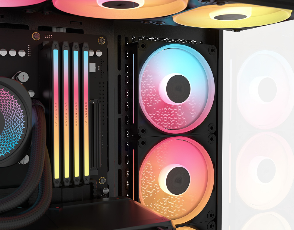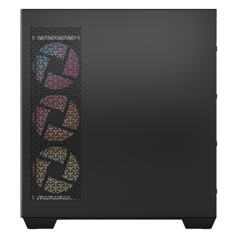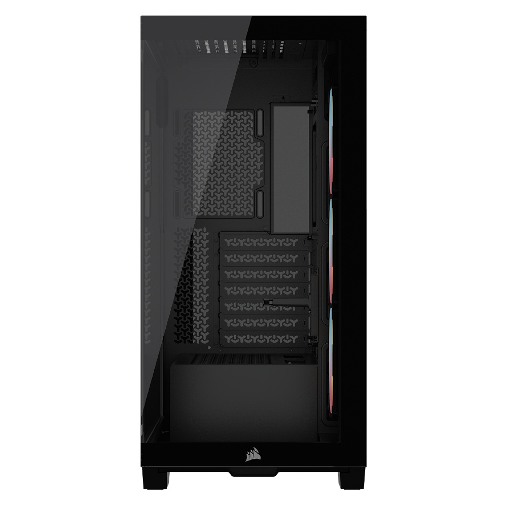 リバースローター設計のiCUE LINKファンを搭載。背面コネクタ設計のマザーボードに対応するピラーレスデザインのミドルタワー型PCケース