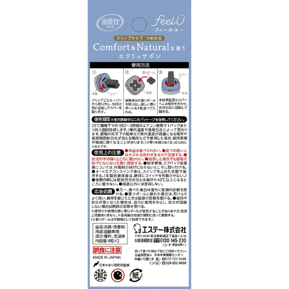消臭力 クルマ用 feelU(フィールユー) クリップタイプ つめかえ エクリュサボン 2回分 [車用 消臭剤 芳香剤]