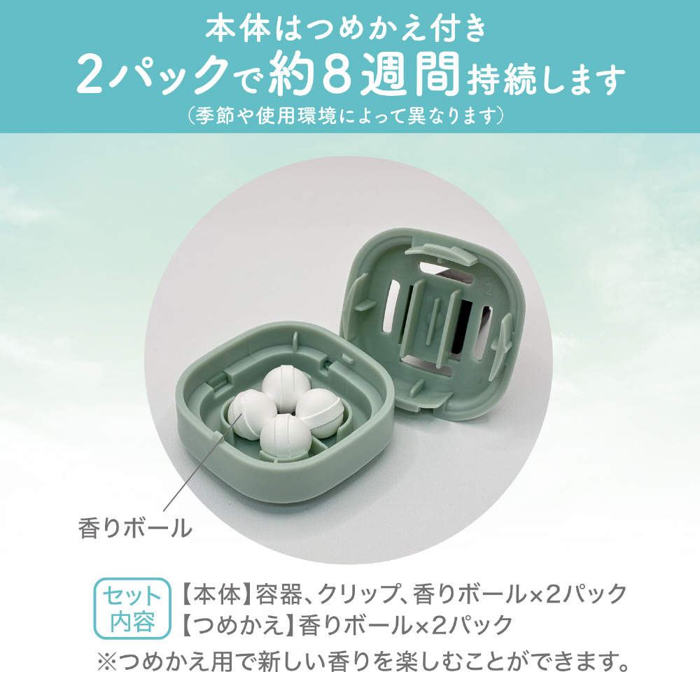 セット内容: 容器、クリップ、香りボール4粒×2パック