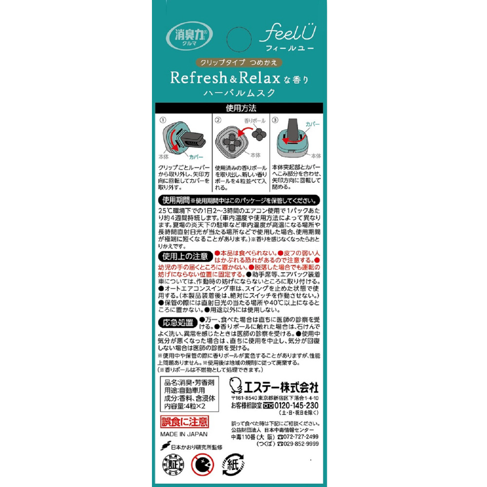 消臭力 クルマ用 feelU(フィールユー) クリップタイプ つめかえ ハーバルムスク 2回分 [車用 消臭剤 芳香剤]
