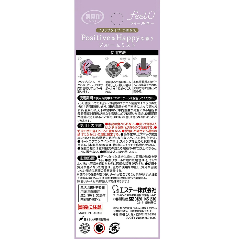 消臭力 クルマ用 feelU(フィールユー) クリップタイプ つめかえ ブルームミスト 2回分 [車用 消臭剤 芳香剤]
