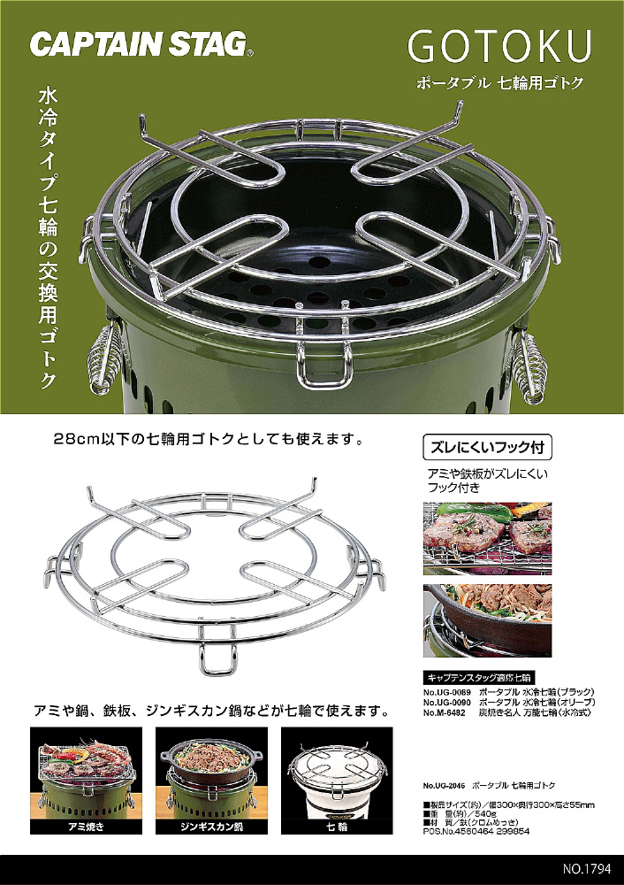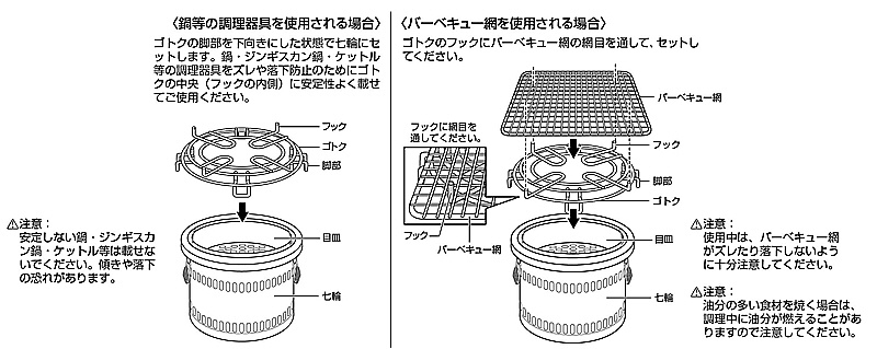 アミや鍋、鉄板、ジンギスカン鍋などが七輪で使えます。