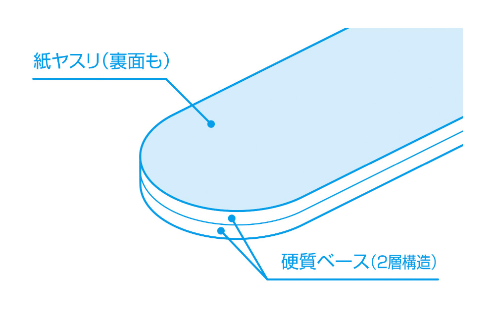 従来品と同様にSOFT2には、芯になる中央部に硬質ベースを、その上下を軟質ベースではさんだ3層構造とし、両面に紙やすりをセットしました。