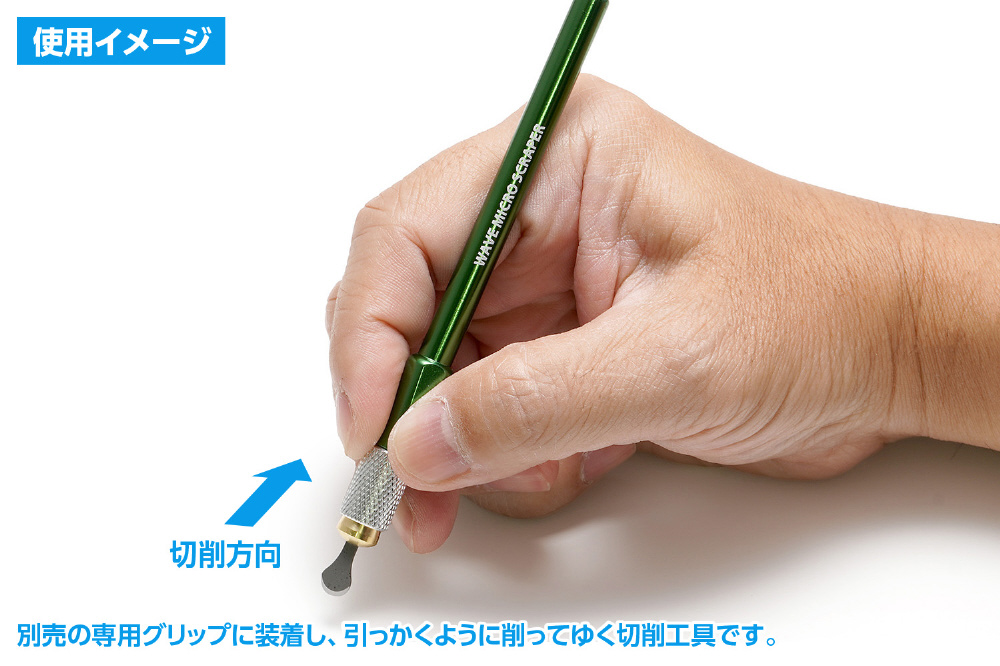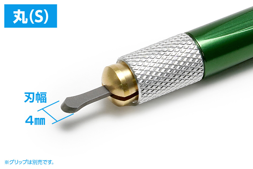 ※グリップは別売です。本製品のご使用には別売の「HGマイクロスクレーパーセット」のグリップ(緑)や「HGマイクロチゼル専用グリップ」に装着する必要があります。説明用の写真に使用しているグリップは「HGマイクロスクレーパーセット」に付属のグリップとなります。説明内の各サイズは参考値です。