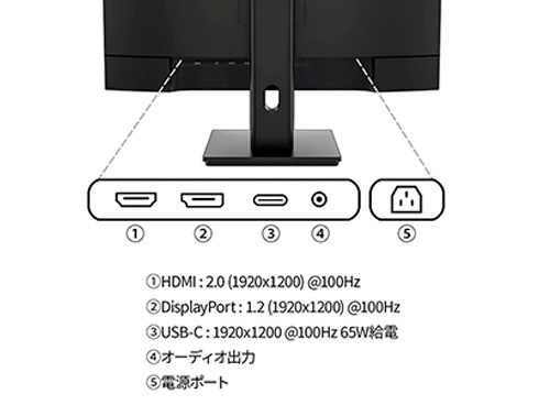 ■インターフェイスは、HDMI 2.0 x1 (100Hz)、DisplayPort 1.2 x1 (100Hz)とUSB-C x1 (100Hz/最大65W給電)を搭載し、様々な機器との接続が可能です。