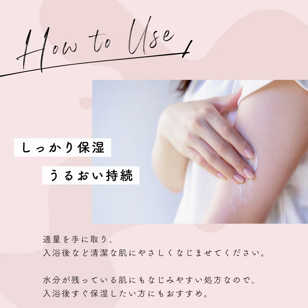 適量を手に取り、入浴後など清潔な肌にやさしくなじませてください。