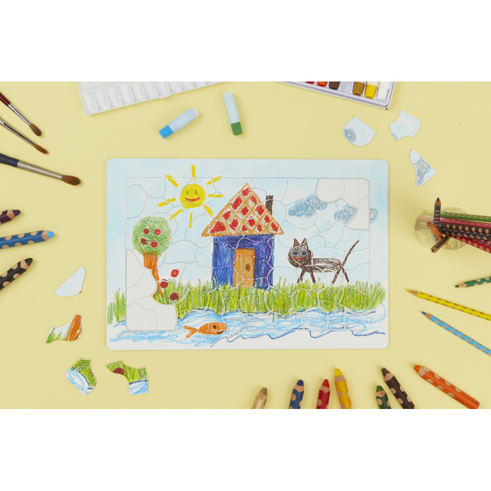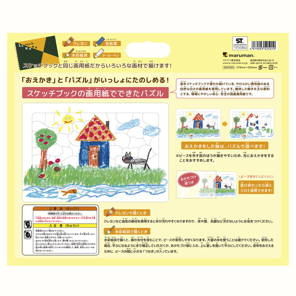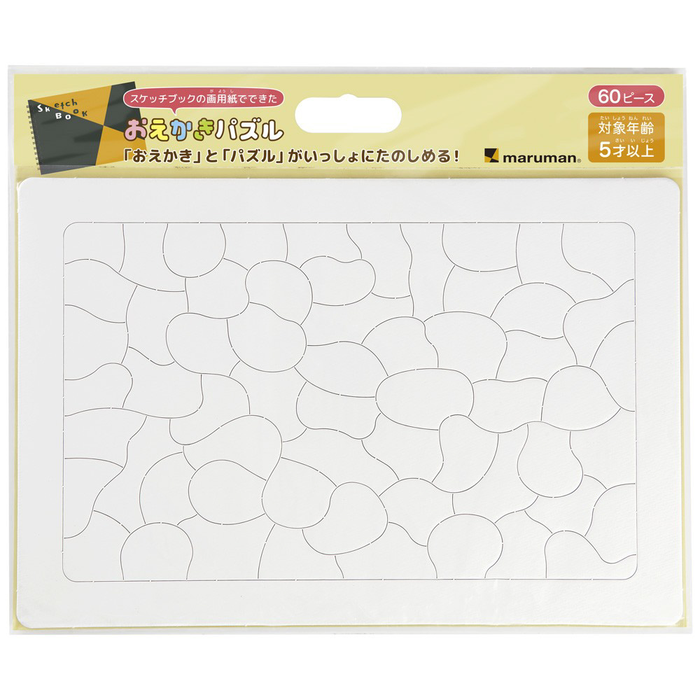 色鉛筆、水彩、クレヨン、マーカーと様々な描画材が使えるマルマンのオリジナル画用紙がパズルになって新登場。子供たちが大好きな「おえかき/ぬりえ」と「パズル」が合体した「おえかきパズル」です。おえかき後とぬりえ後にパズルで何度も楽しめて、屋内での遊びにピッタリ!B4サイズ、60ピース