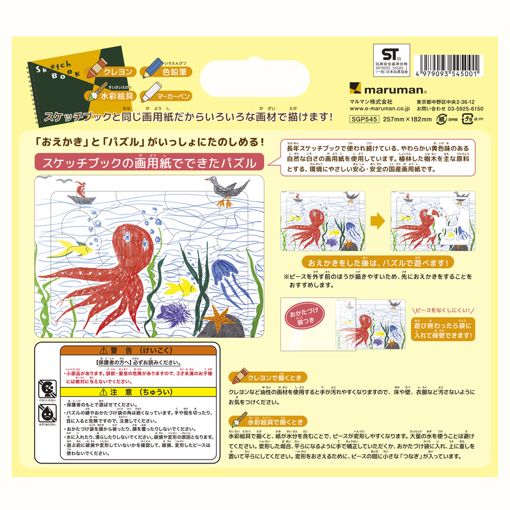 色鉛筆、水彩、クレヨン、マーカーと様々な描画材が使えるマルマンのオリジナル画用紙がパズルになって新登場。子供たちが大好きな「おえかき/ぬりえ」と「パズル」が合体した「おえかきパズル」です。おえかき後とぬりえ後にパズルで何度も楽しめて、屋内での遊びにピッタリ!B4サイズ、60ピース