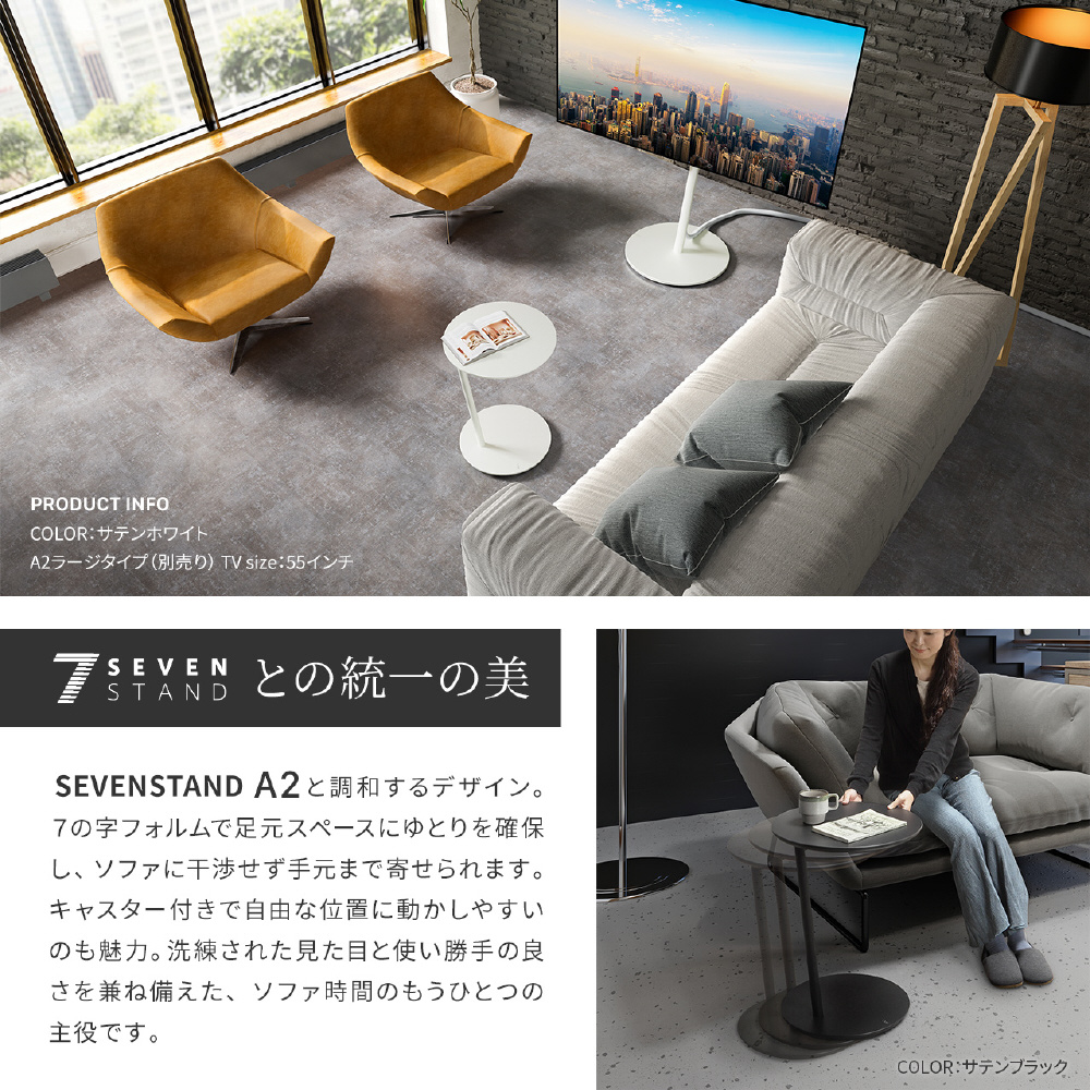 テレビスタンドA2シリーズと同デザインで塗装の仕上げも同じなので組み合わせてお使い頂けます。カラーはサテンホワイト、サテンブラックの2色展開。