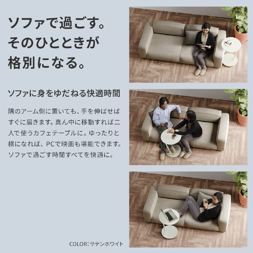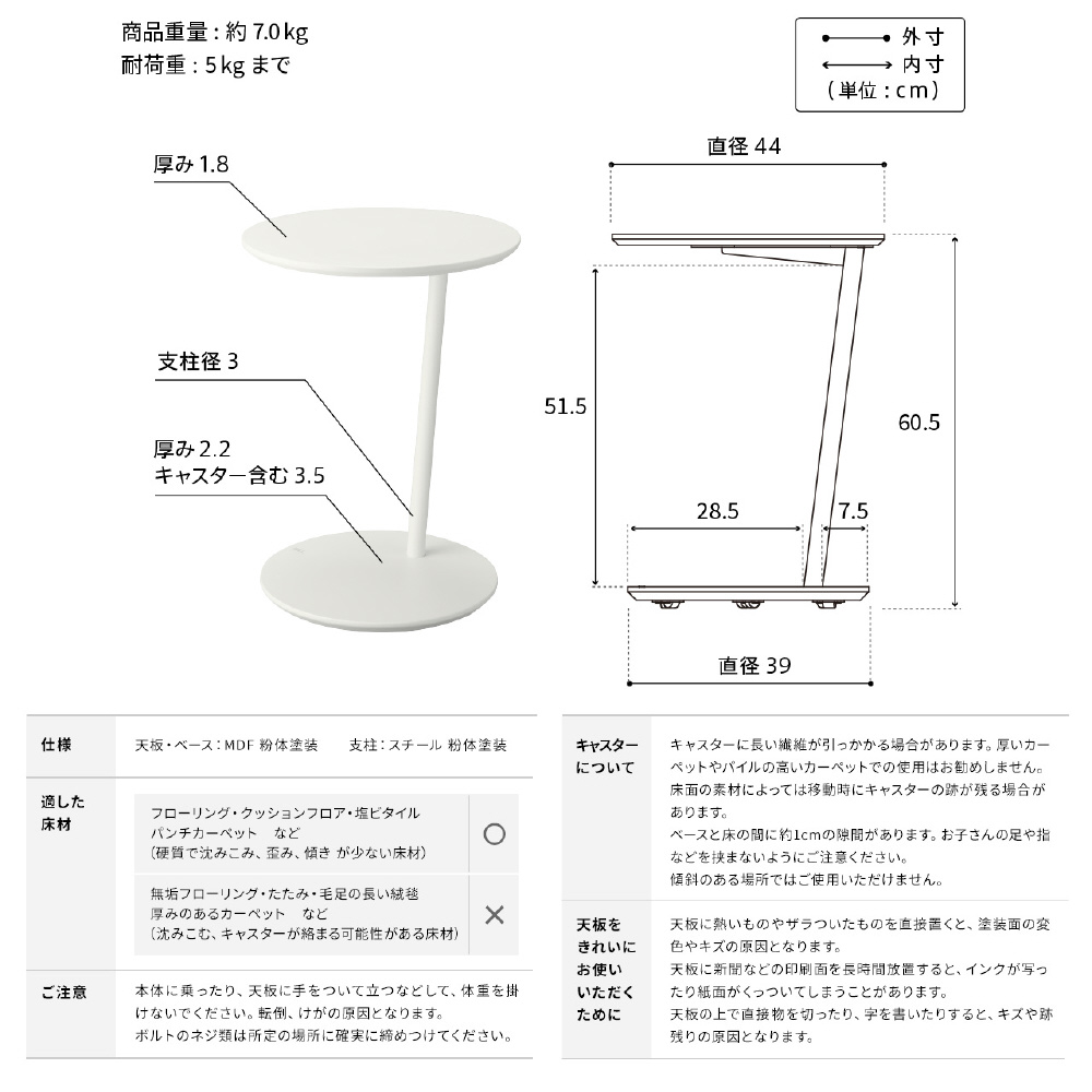 天板サイズは径が44cmでノートパソコンを使うにも十分なサイズ。高さは60.5cmとソファーサイドやベッドサイドに最適。*天板耐荷重は5kg