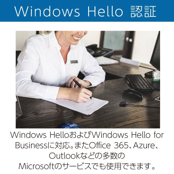 Windows HelloおよびWindows Hello for Businessに対応。またOffice 365、Azure、Outlookなどの多数のMicrosoftのサービスでも使用できます。