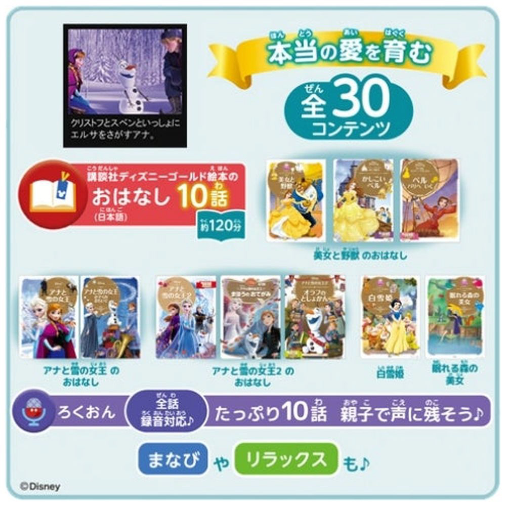 講談社ディズニーゴールド絵本から、『アナと雪の女王』『美女と野獣』や『白雪姫』『眠れる森の美女』等10話分を収録!(日本語のみ対応)