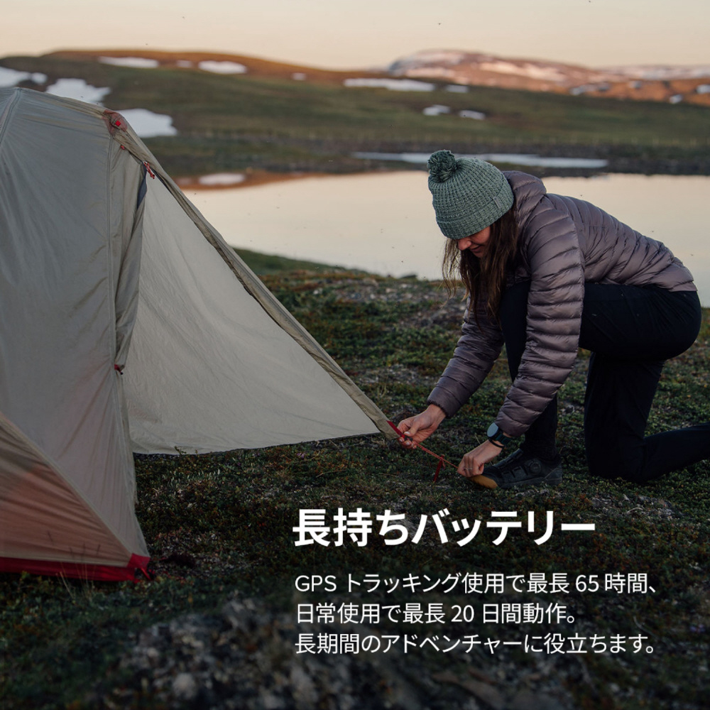 タイムモード稼働時間:約40日間(毎日24時間の追跡およびモバイル通知:約20日間)、GPSデュアルバンド稼働時間:約65時間、GPSシングルバンド稼働時間:約75時間