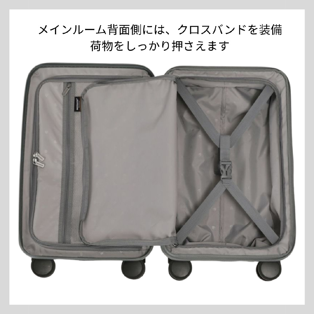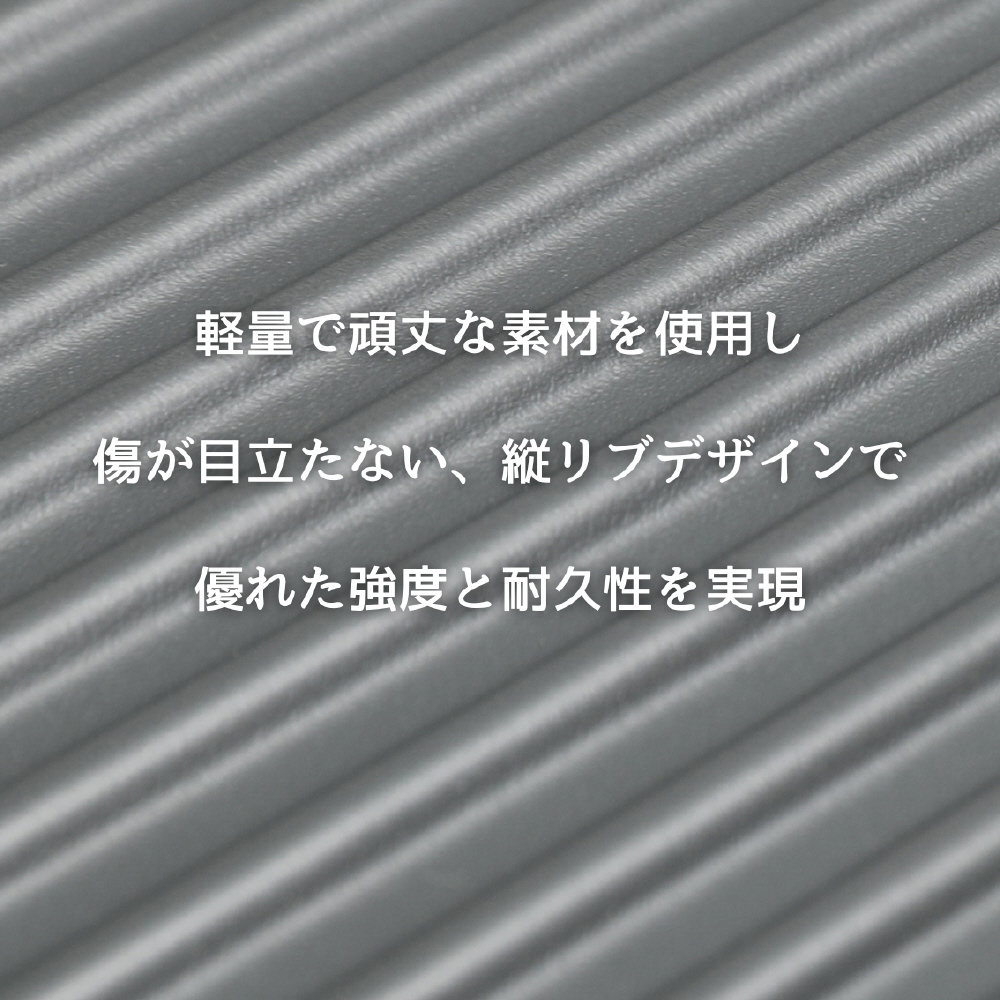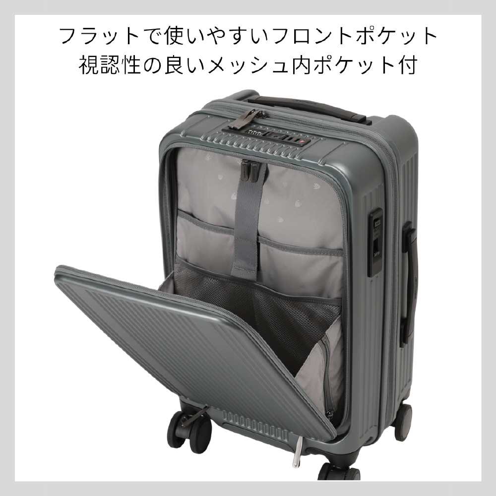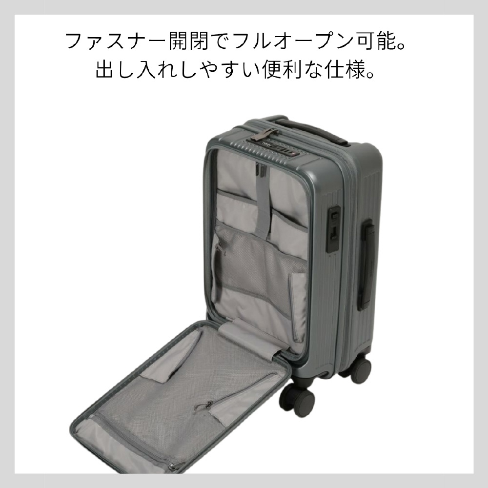 軽量かつ頑丈なポリカーボネート100%素材を採用し、傷が目立ちにくい縦リブデザインで高い強度と上質感を両立。通勤から出張・旅行まで幅広く対応できるフロントオープンタイプのスーツケースです。荷物の増減に応じて約37L→43Lへ拡張可能なエキスパンダブル機能も搭載しています。