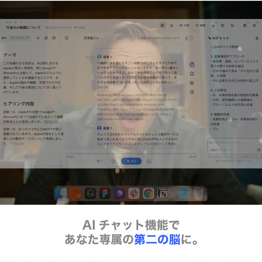 会議や通話をAIが自動で記録・文字起こしし、話し終える頃には議事録が完成します。
