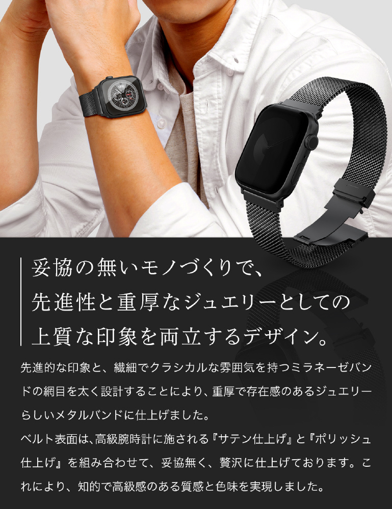 先進的な印象と、繊細でクラシカルな雰囲気を持つミラネーゼバンドの網目を太く設計することにより、重厚で存在感のあるジュエリーらしいメタルバンドに仕上げました。