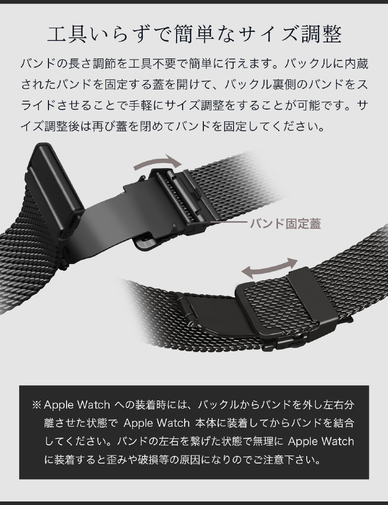 バンドの長さ調節を工具不要で簡単に行えます。バックルに内蔵されたバンドを固定する蓋を開けて、バックルが裏側のバンドをスライドさせることで手軽にサイズ調整をすることが可能です。