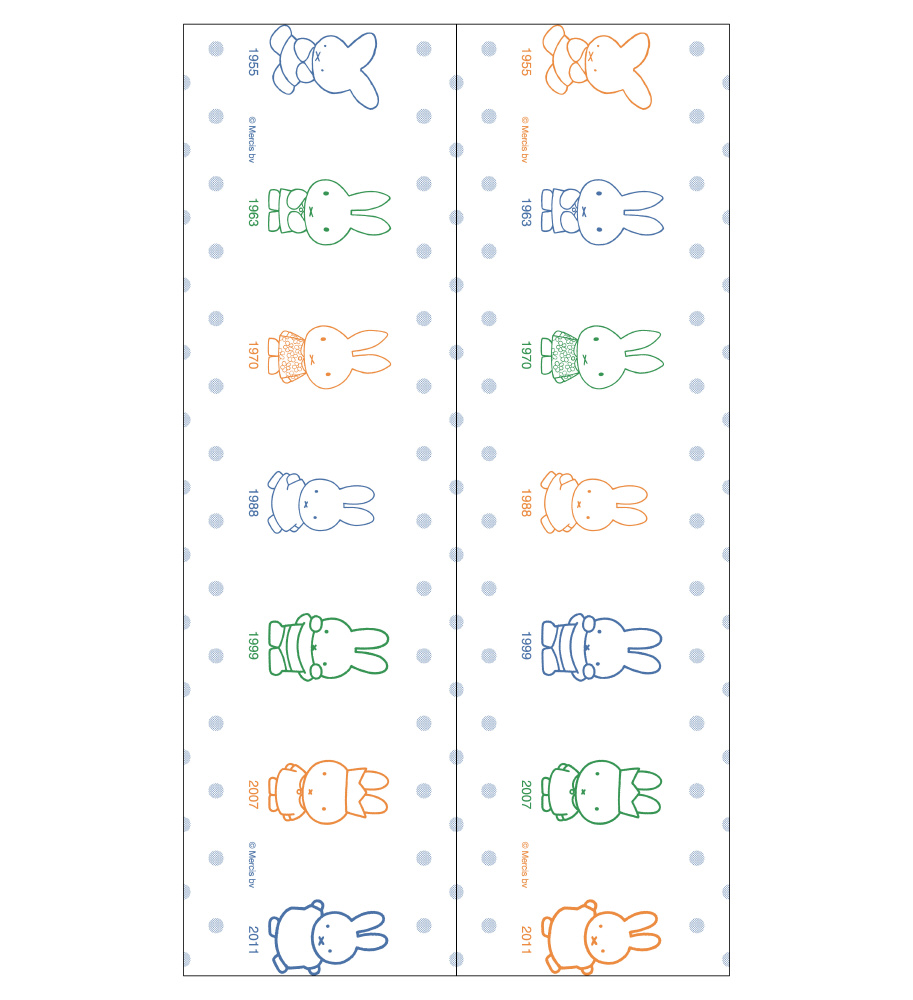 ・時代ごとに少しずつ変化したタッチで描かれたミッフィーが並ぶ、世代を問わず楽しめるデザインです。