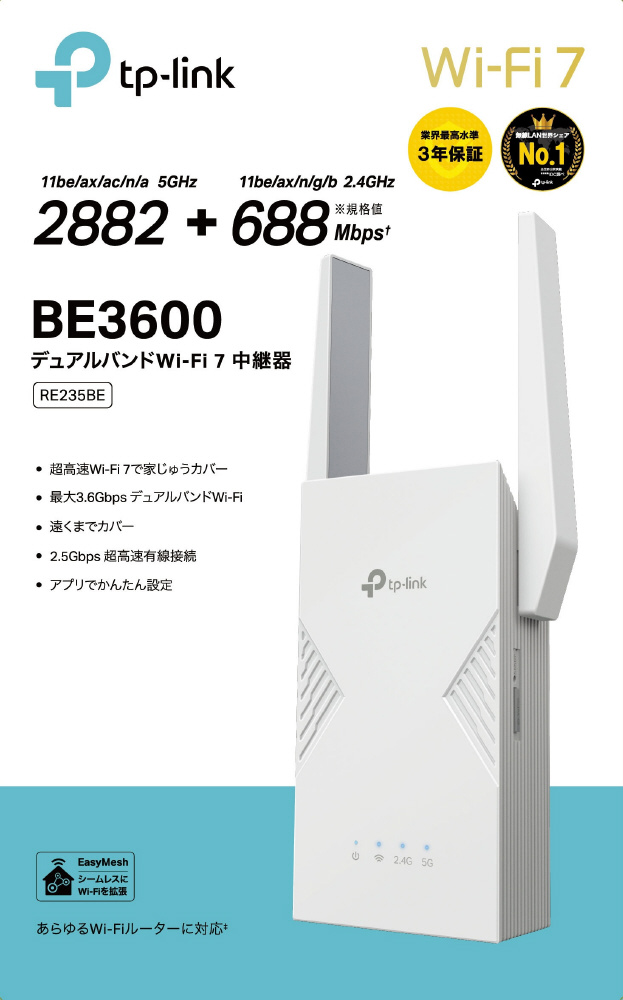 「BE3600 デュアルバンドWi-Fi 7中継器」