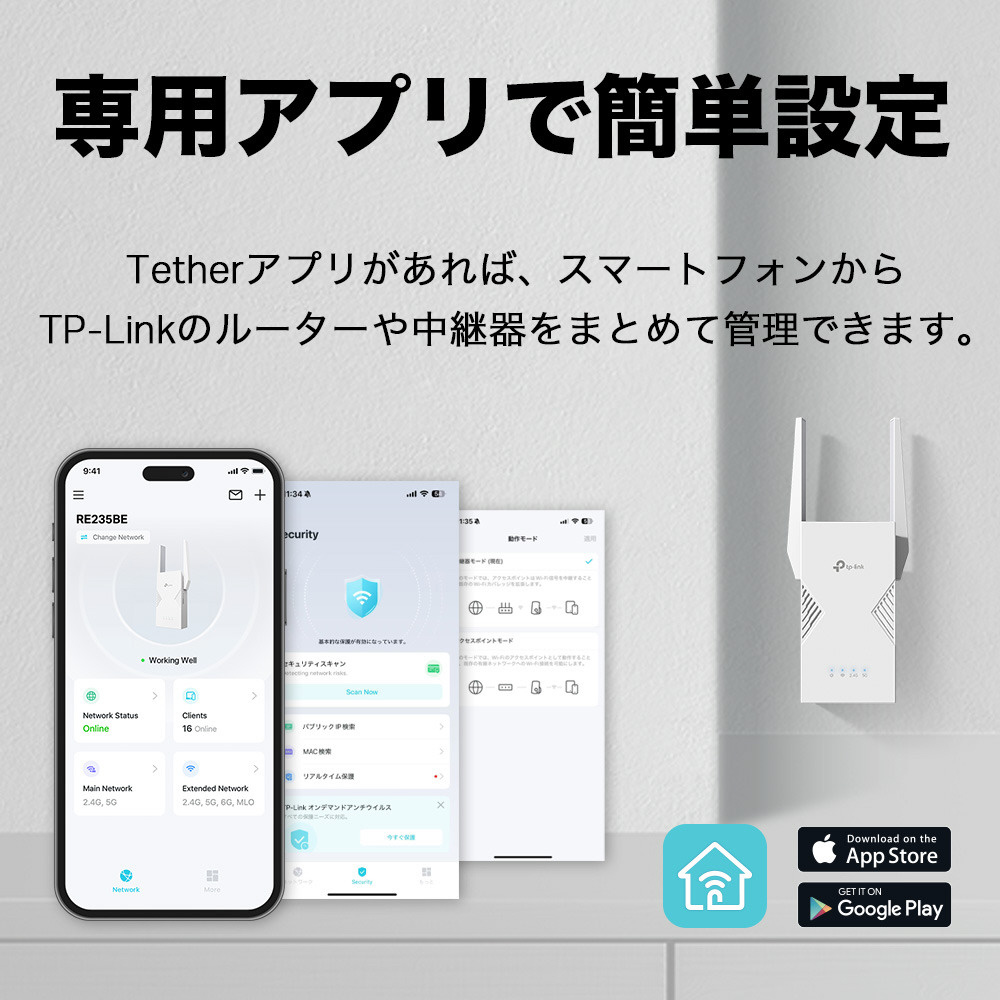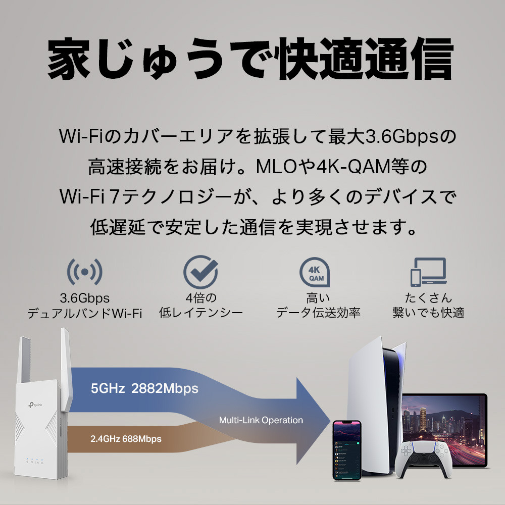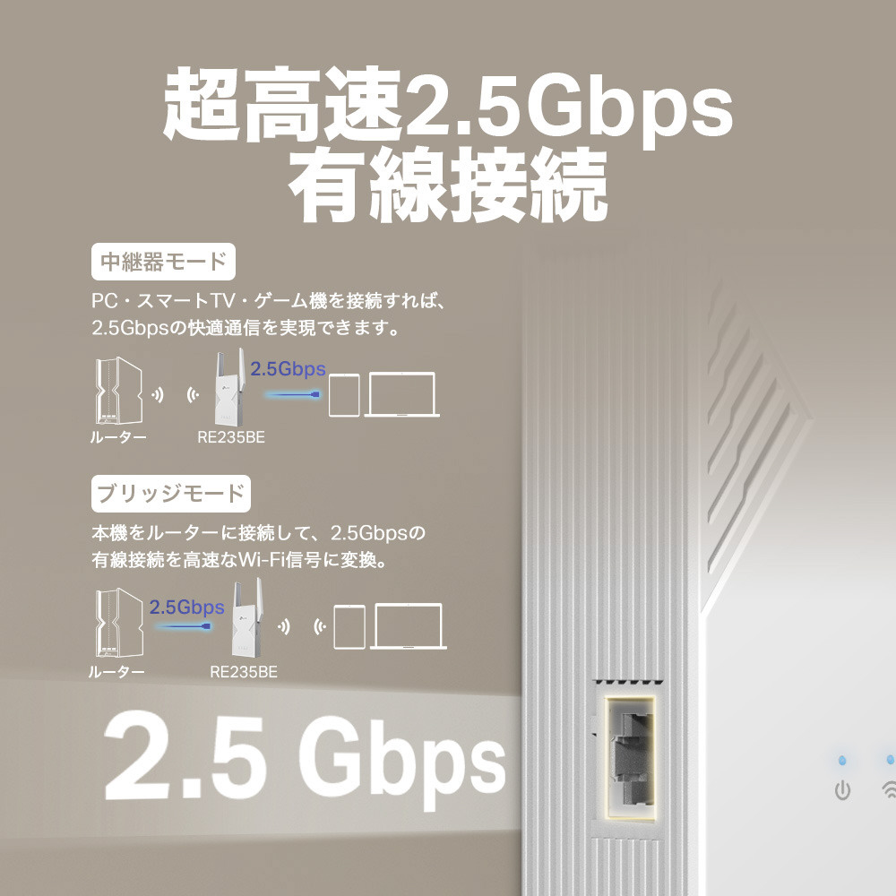 3.6Gbpsの高速通信と2.5Gbpsポート搭載で無線も有線も快適。Wi-Fi 7対応中継器