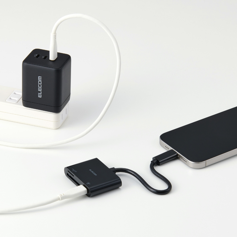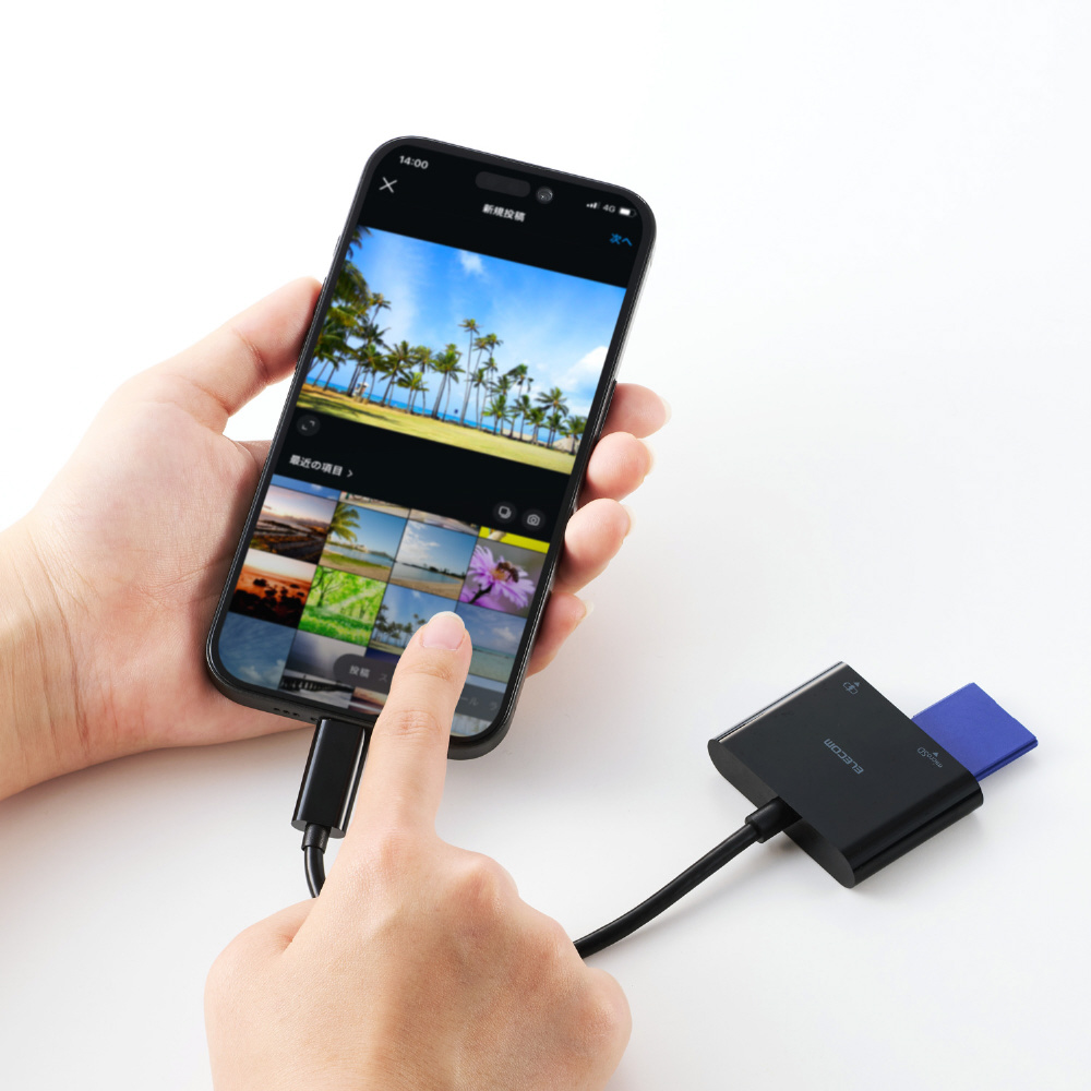 撮影データの転送をもっと速く快適に!パソコンやスマホなどへの接続に便利なUSB Type-C(TM)プラグのケーブル付きメモリーカードリーダーです。パソコンやスマホを充電しながらデータ転送が可能。SD/microSDの2スロットを同時に使用でき、デジタルカメラなどで撮影した画像や映像データを接続した機器へまとめて転送できるので、データ編集やSNS投稿に便利です。