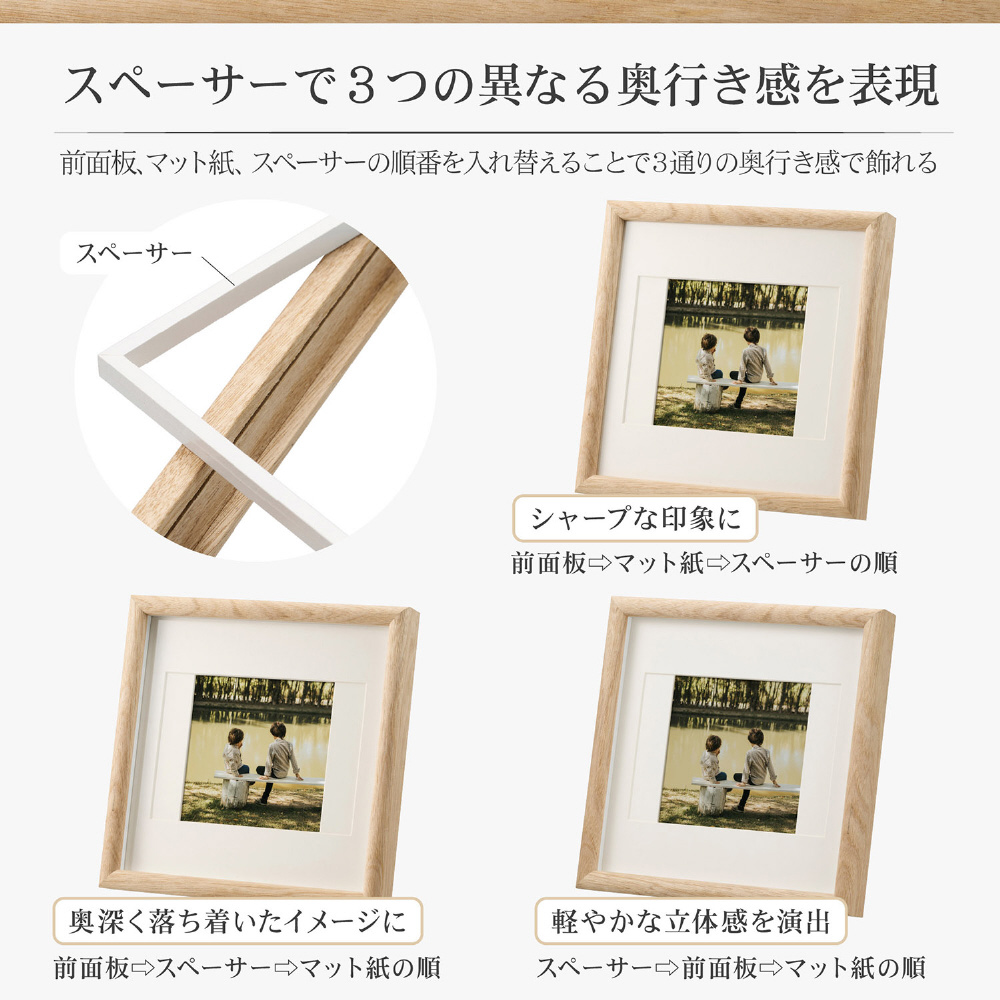 前面板やスペーサーの順番を入れ替えることで、3通りの異なる奥行き感を表現できる木製フォトフレーム。
