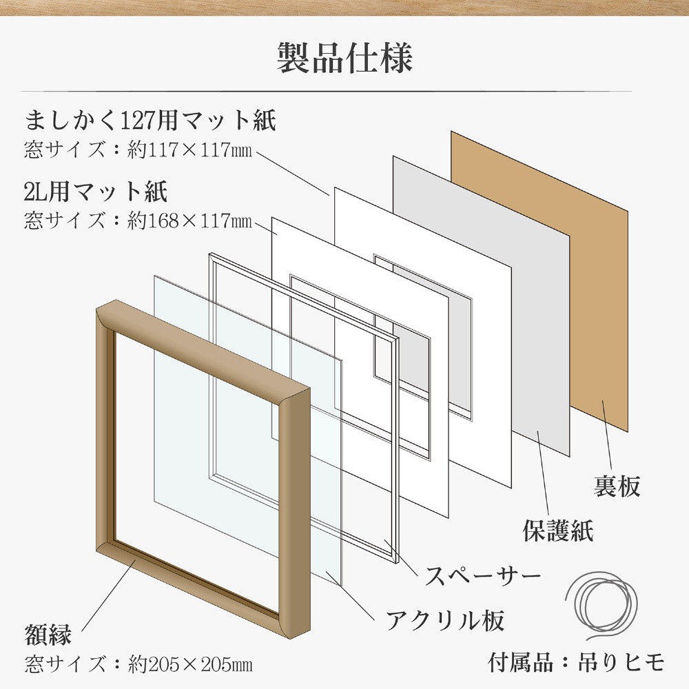 付属のマット紙を入れ替えることで、ましかく(127×127mm)サイズ、2Lサイズに対応します。