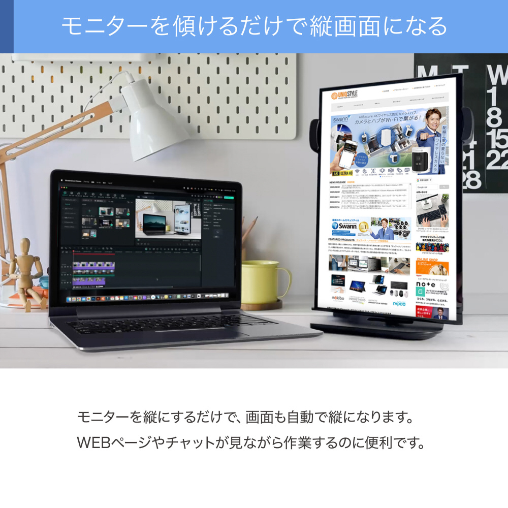 モニターを縦、横に傾けるだけでセンサーが感知し、画面の向きを自動で切り替えてくれます。縦向きにするとWeb ページやチャットの閲覧に便利です。