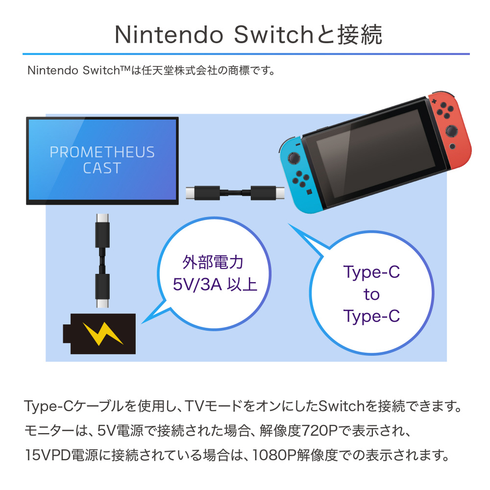 Type-Cポートとmini HDMI ポートがあるので、ケーブルでの接続も可能です。SONY PlayStation やNintendo Switch、XBOX ONEなどのゲーム機ともケーブルで接続できます。接続に必要なケーブルは全て付属しています。