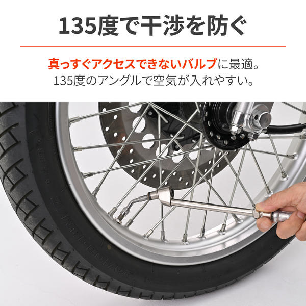 135°のアングルで空気入れがしやすくなる延長バルブ。