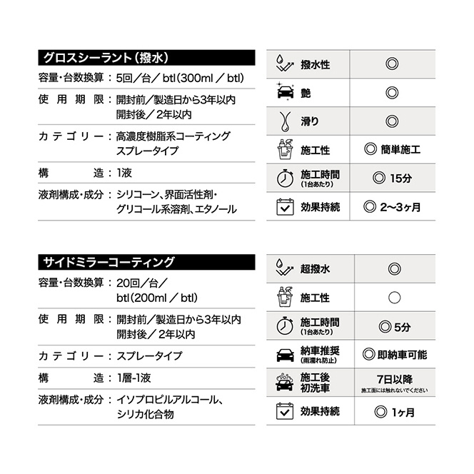 仕様2 台数換算:リフレッシュシャンプー:15回/台 グロスシーラント:5回/台 サイドミラーコーティング:20回/台