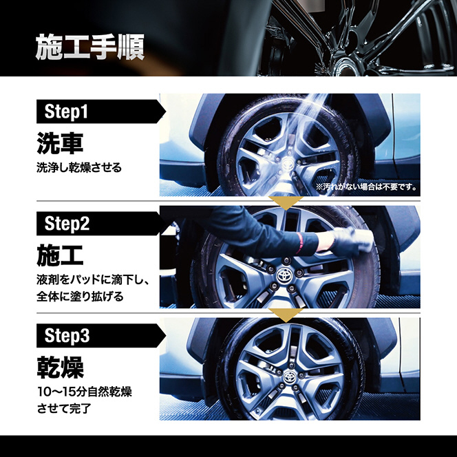 その後液剤を適量パッドに滴下し、タイヤ表面全体に塗り広げてください。10〜15分自然乾燥で完了です。